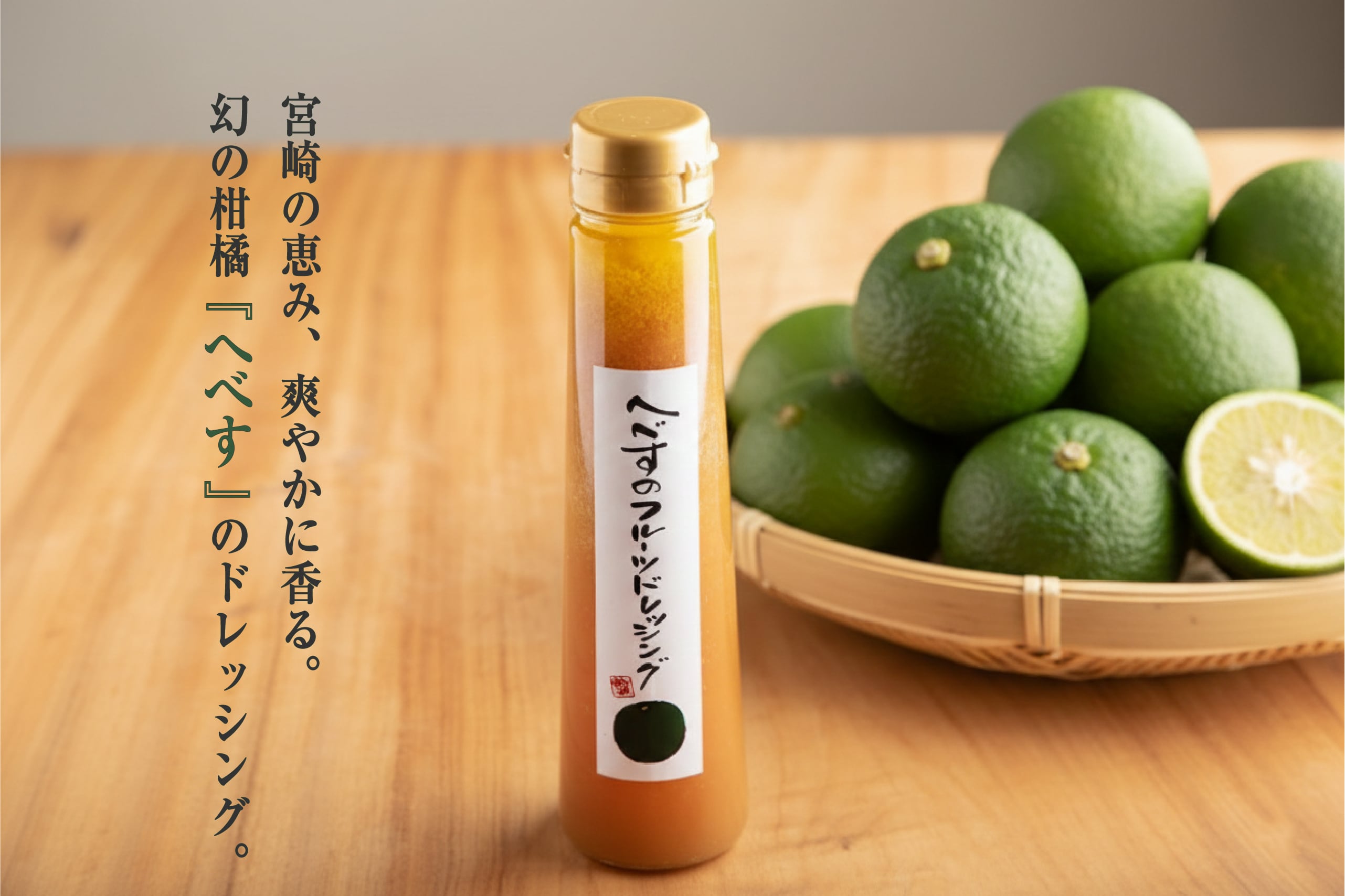 「幻の柑橘」とも呼ばれる宮崎県産へべすの生果汁を贅沢に使用した、手作りのフルーツドレッシングです。